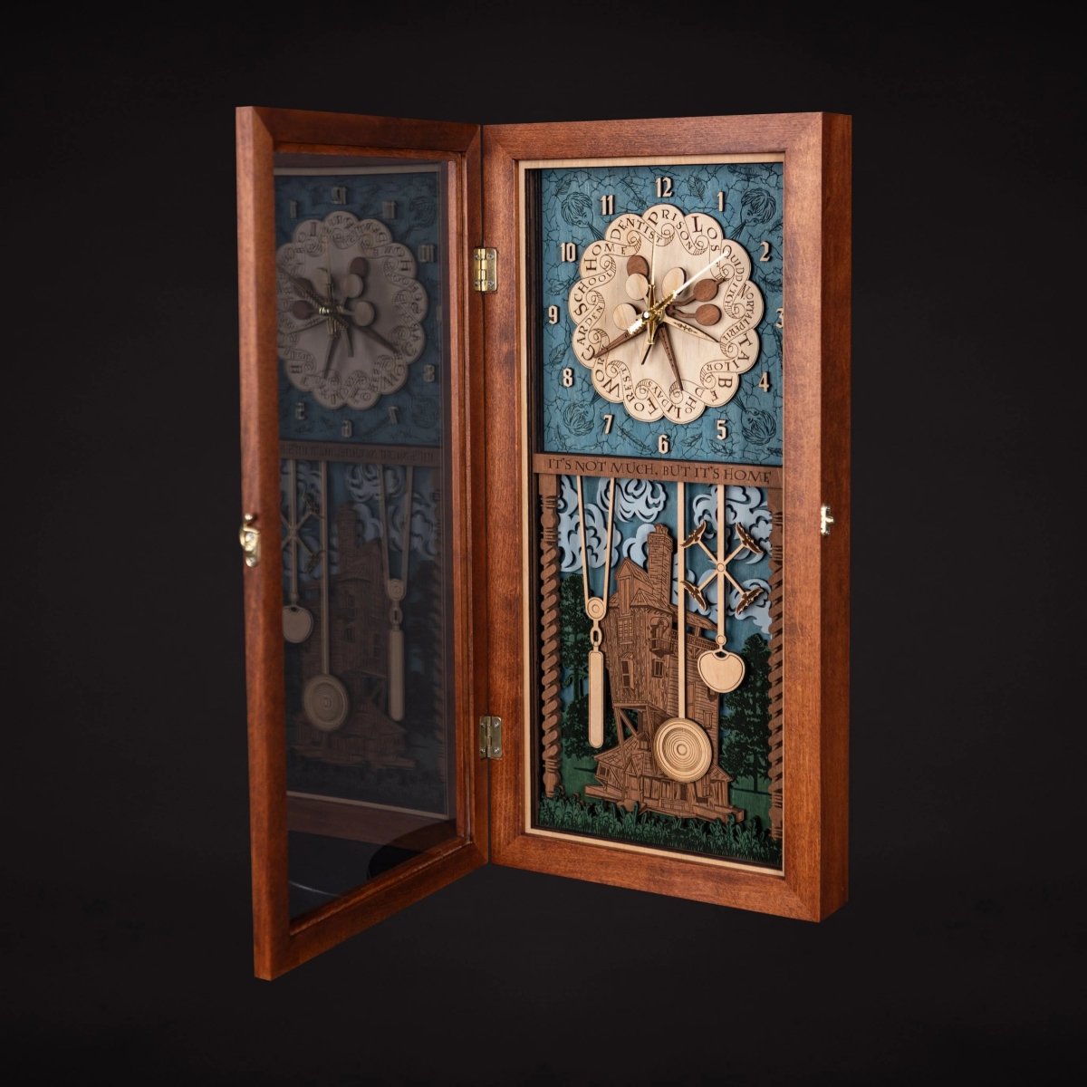 Front view of the Weasley Family™ Clock – a magical Harry Potter-themed wooden housewarming gift