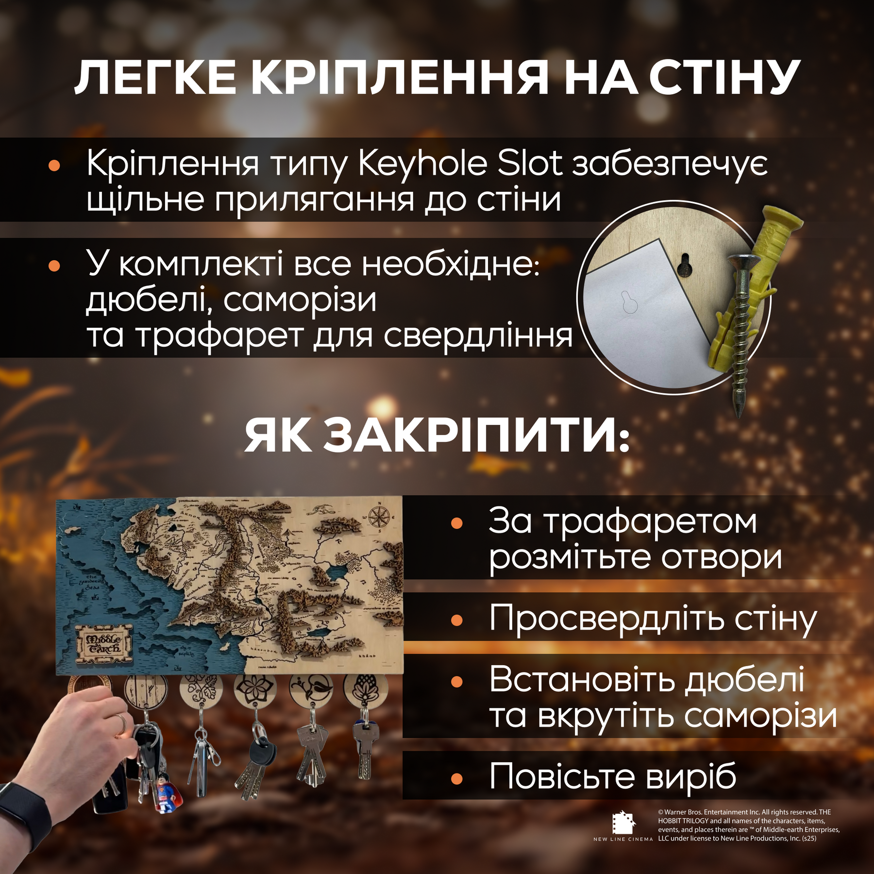 • Прикріпіть магнітну карту брелока Середзем'я до своїх ключів.